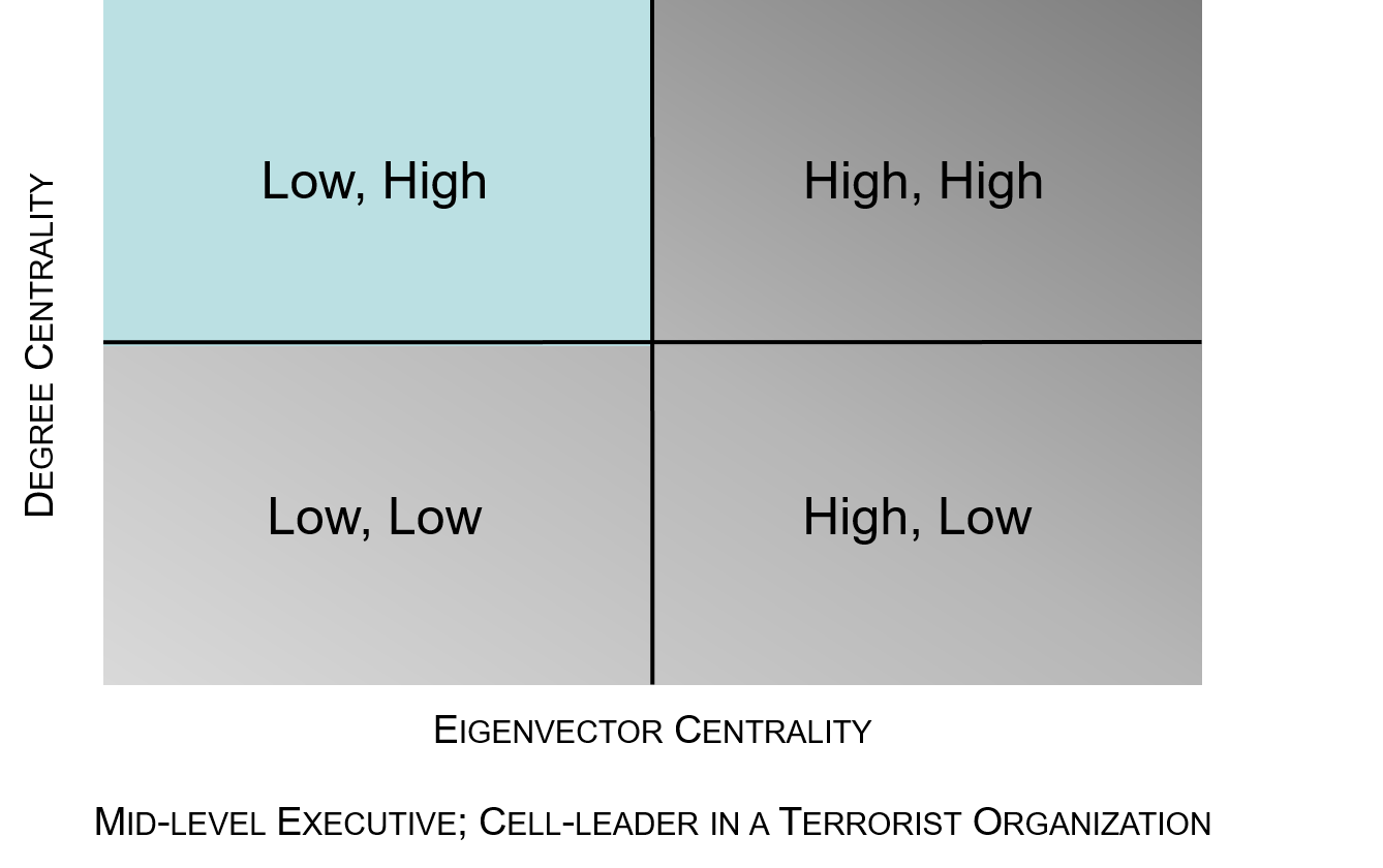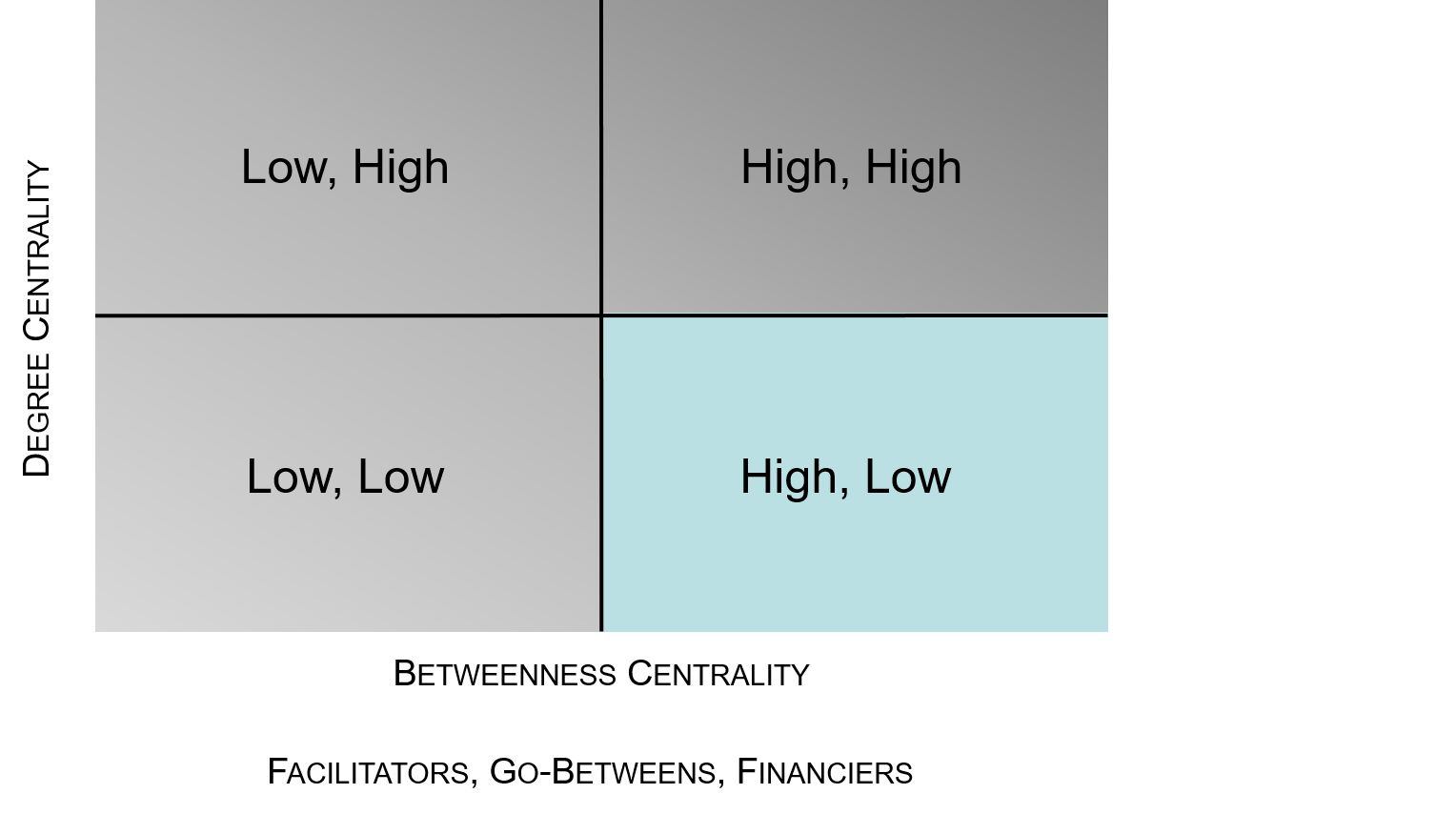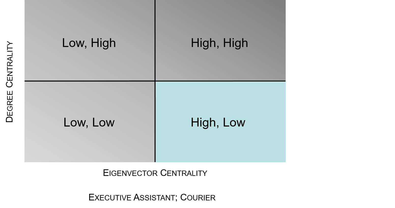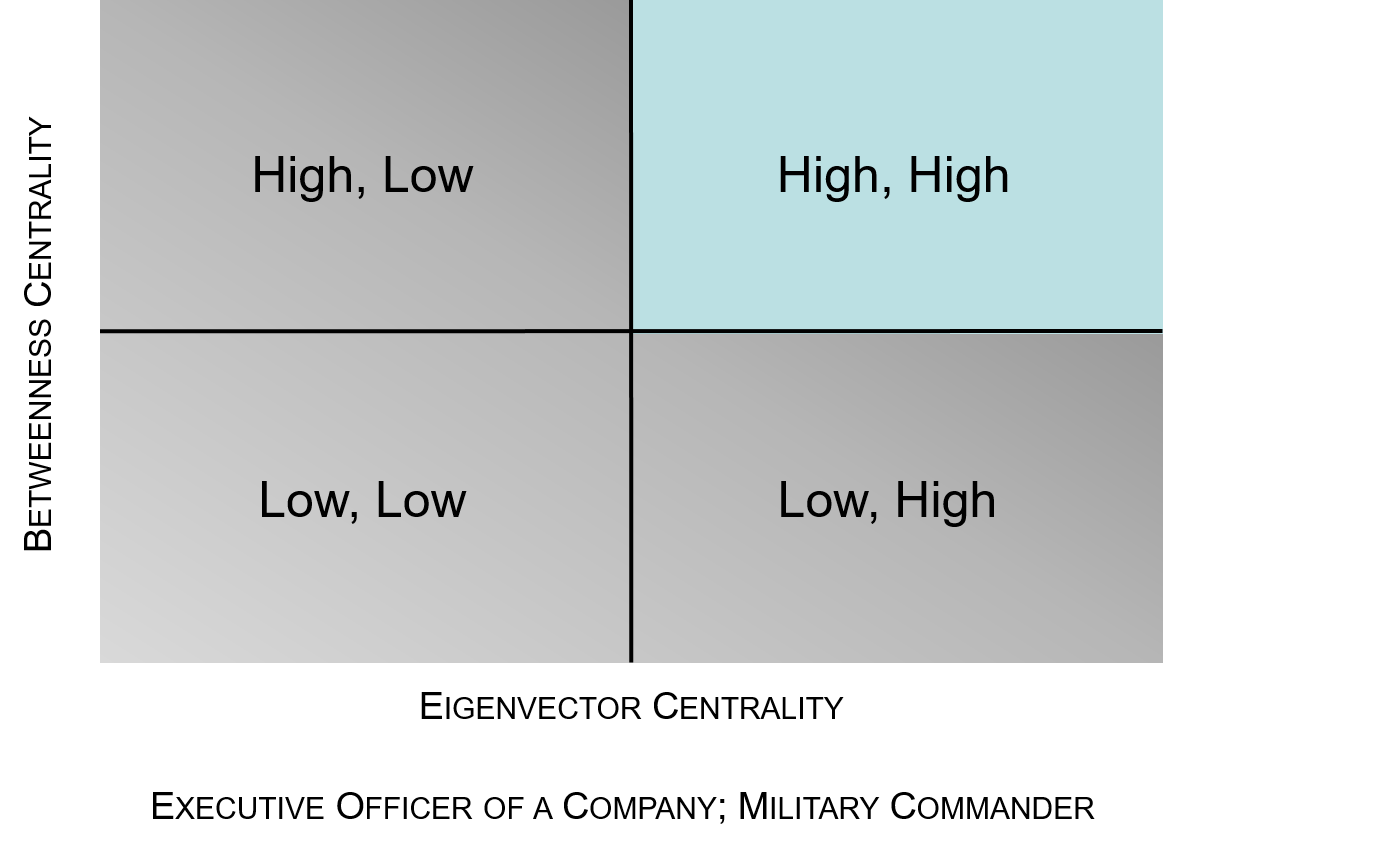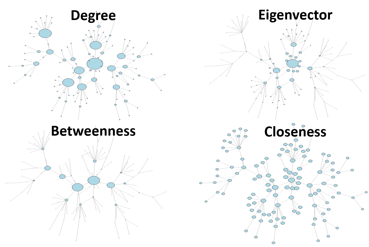| Eigenvector (frequency) | Weights an actor’s degree centrality by the degree centrality of its neighbors. | Indirect influence or power; Potential social capital. | In well-connected networks (or sub- networks, such as cliques), it is often difficult to identify a single, or a few, potentially powerful actors. |