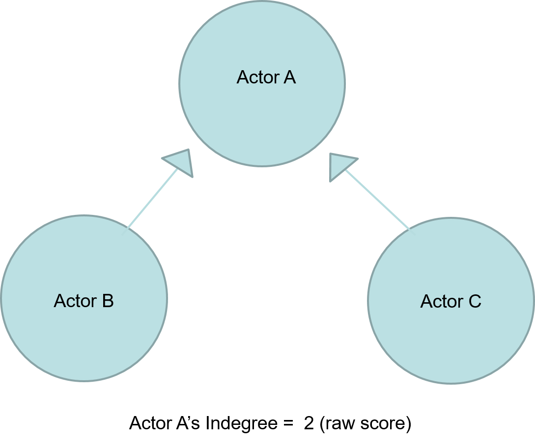 | Indegree (frequency) | Count of direct incoming ties. | Highly sought after (resources, wisdom). | Accounts only for direct incoming ties, but not indirect relations. |