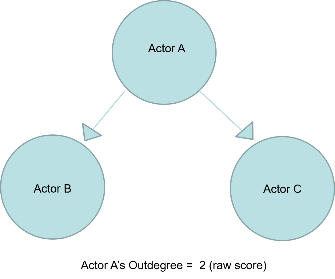 | Outdegree (frequency) | Count of direct outgoing ties. | Highly active; Distributor of material and/or nonmaterial goods. | Accounts only for direct outgoing ties, but not indirect relations. |