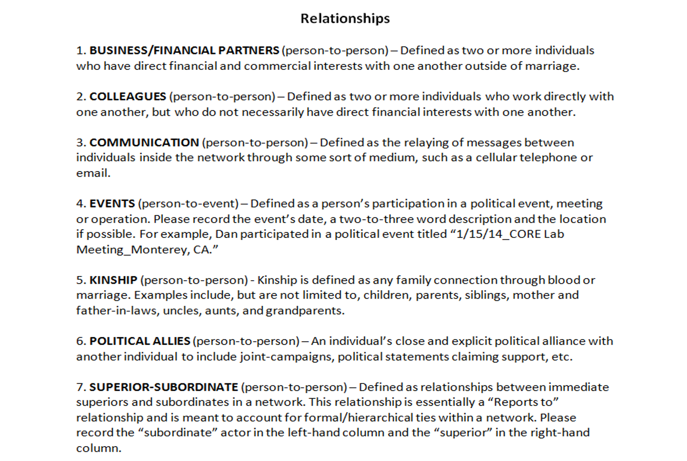 Binary/dichotomous Networks - networks where relational values indicate only the presence or absence of a tie between actors. A tie either exists or it does not (i.e., Yes = 1 or No=0).